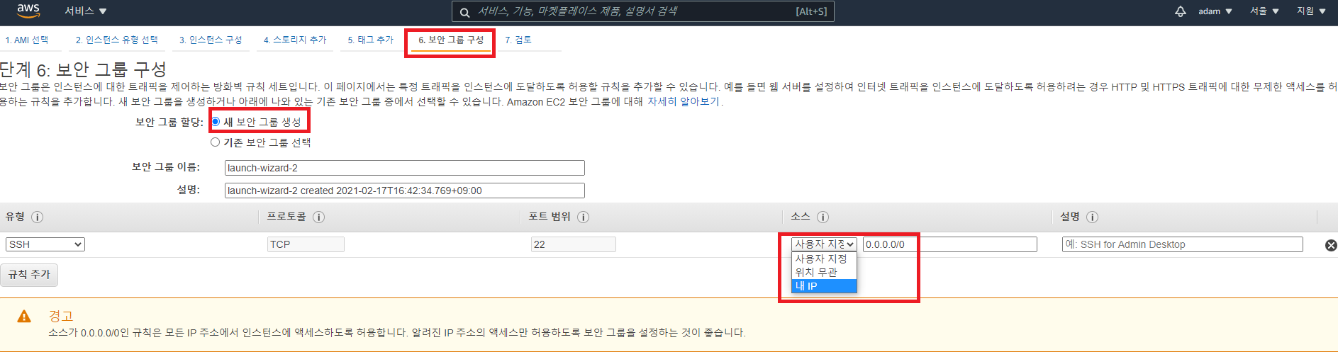 - 이때 유형을 SSH로 선택하고 소스에 내 IP를 선택하면 내 PC에서만 접근이 가능하도록 할 수 있다.
