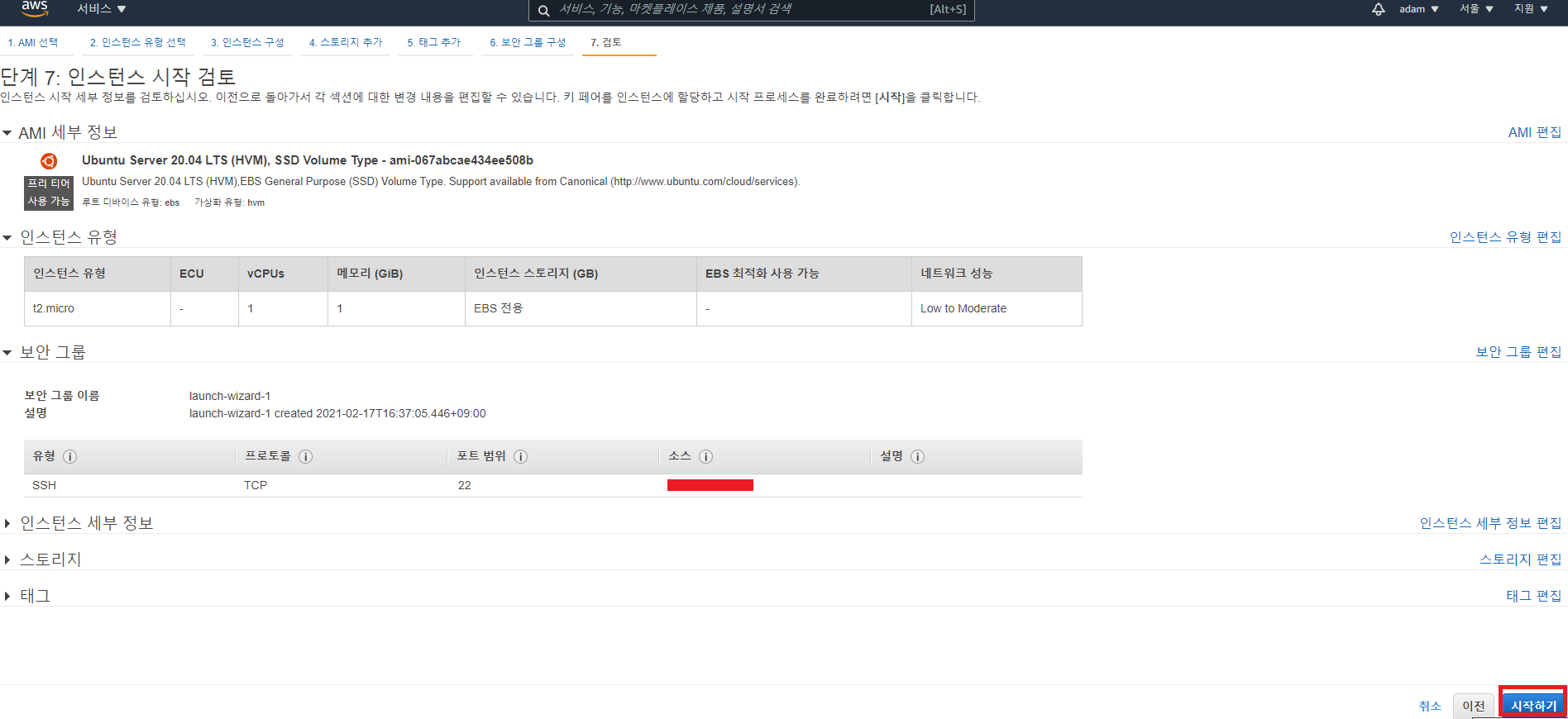 6. 새로운 보안그룹 설정이 완료되면 우측 하단의 검토 및 시작 버튼을 클릭하여 다시 검토 화면으로 이동한다.