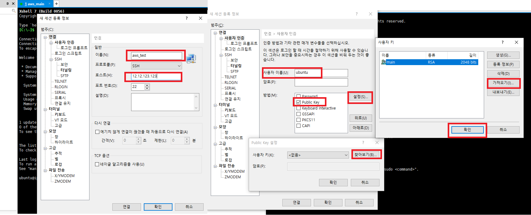 - 사용자 인증탭으로 이동해서 사용자 이름에 ubuntu 적고 방법에 Public key를 선택한 후 설정으로 들어간다.