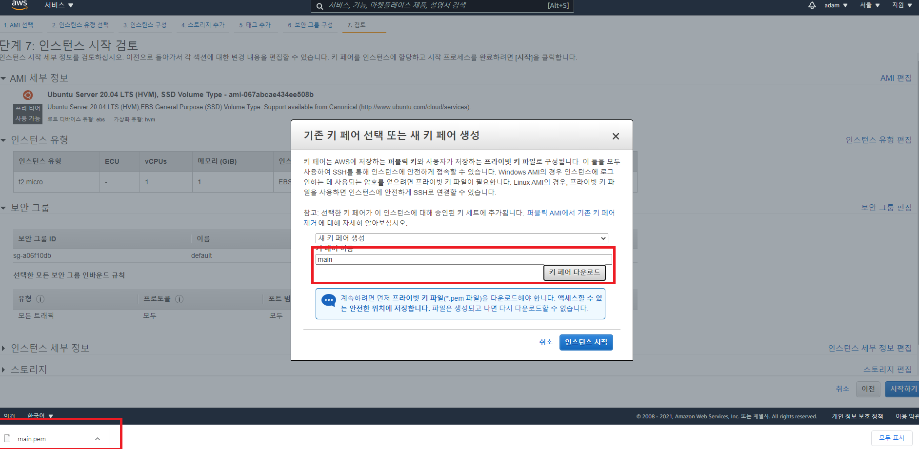 - 여기서 다운로드 받은 *.pem 키는 서버에 접속할때 인증 수단이므로 잘 보관하도록 한다.