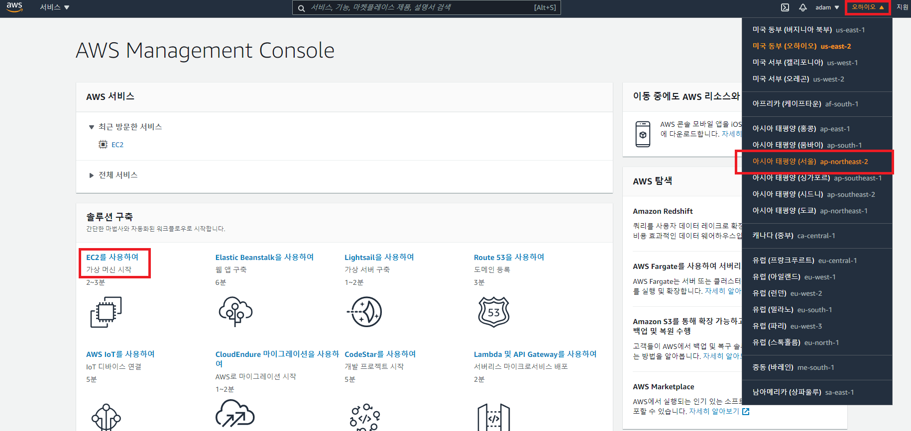 - 최초 로그인 하면 지역이 한국(서울)로 설정되어있지 않을 수 있다. EC2를 생성하기 전에 지역먼저 변경 해준다.
