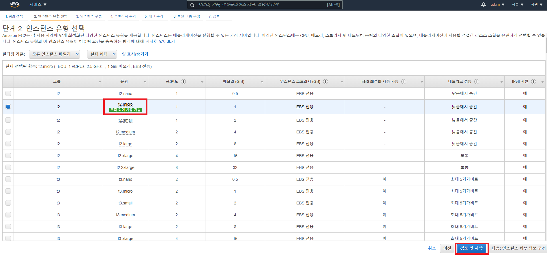 - 기본으로 선택되어있는 t2.micro 프리티어를 선택하고 검토 및 시작을 한다.