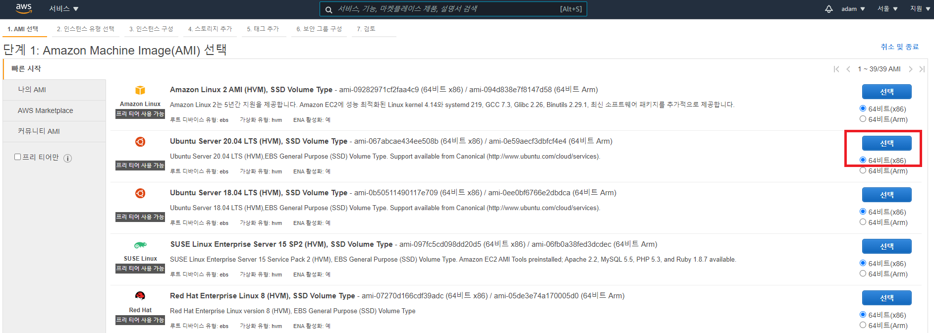 3. 첫번째 단계 서버 종류를 선택하고 다음으로 넘어간다. (난 우분투를 선택하였다)