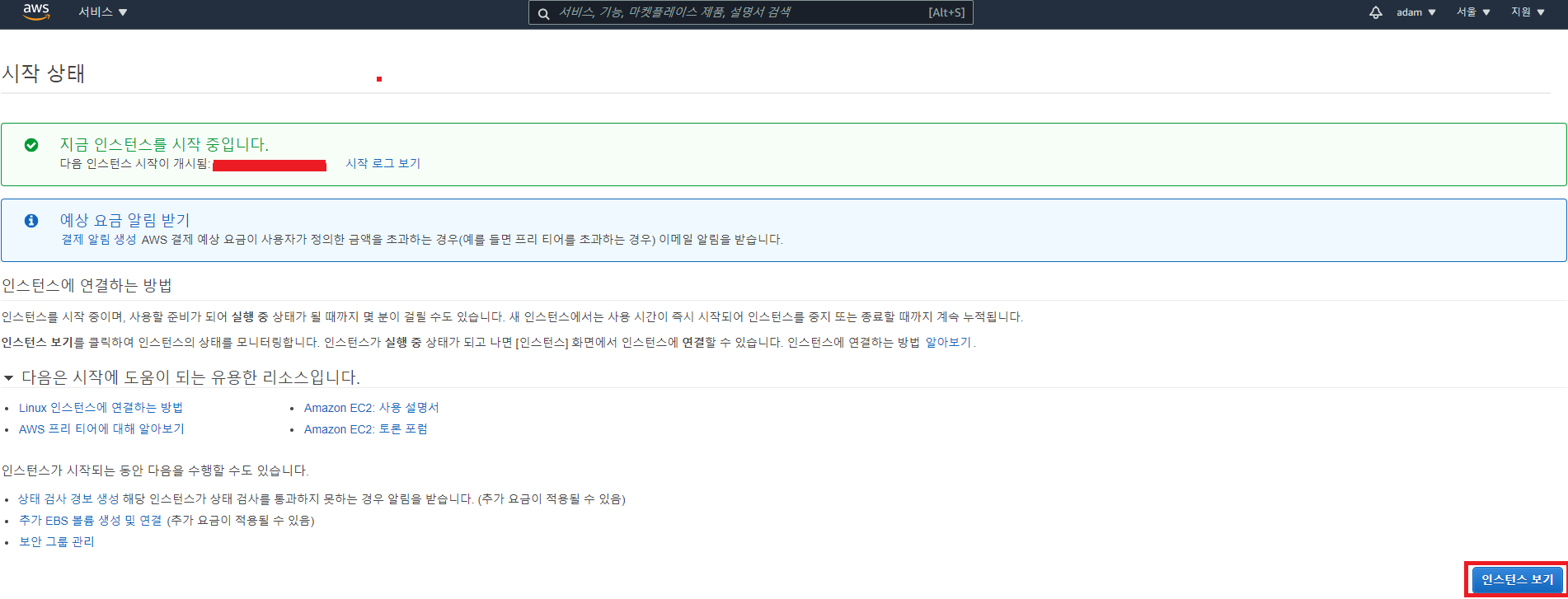 8. 아래 완료 화면에서 인스턴스 보기를 누르면 생성된 인스턴스의 상세 정보를 볼 수 있다.