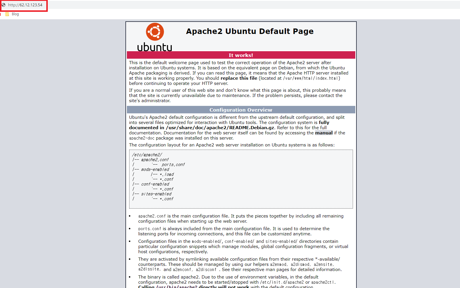 - 아래 화면처럼 아이피를 입력했을때 apache2의 default page가 나오는걸 볼 수 있다.