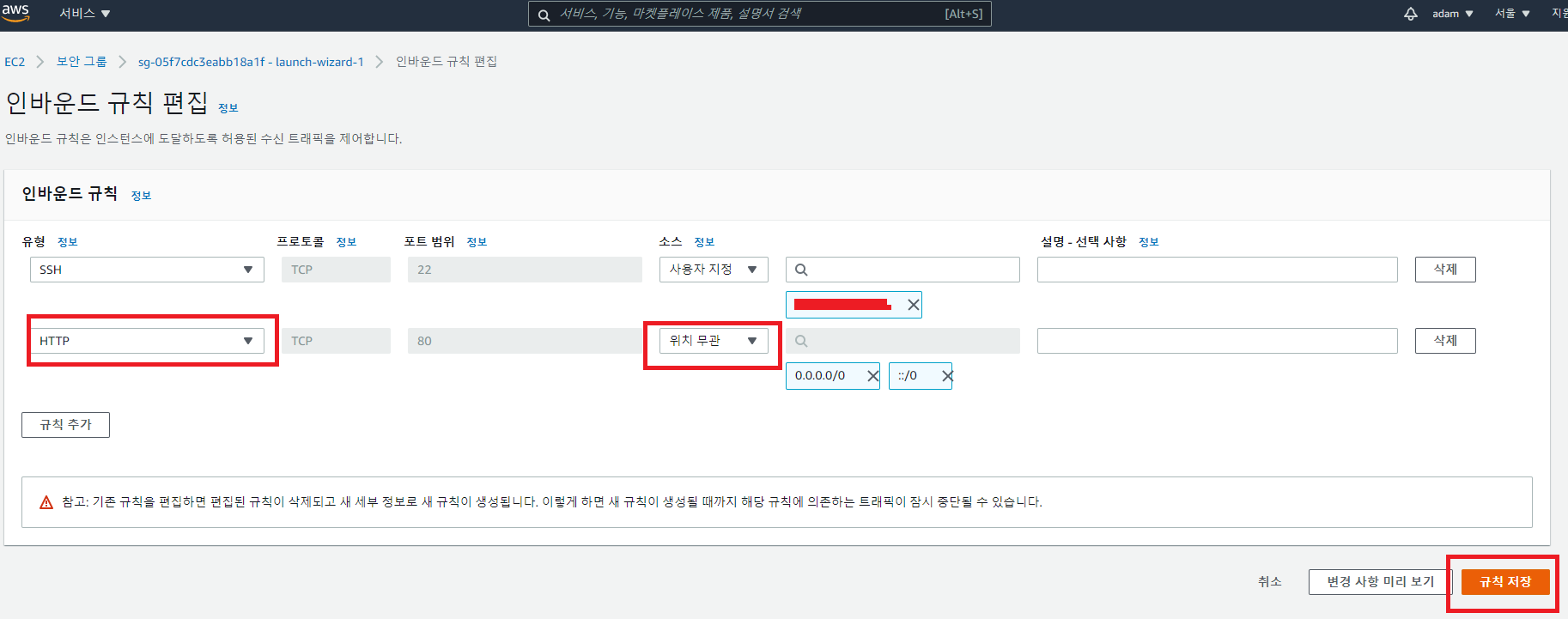 - 인바운드 규칙 편집에 들어가서 유형에 HTTP, 그리고 소스를 위치무관으로 설정한 후 규칙 저장을 클릭한다.