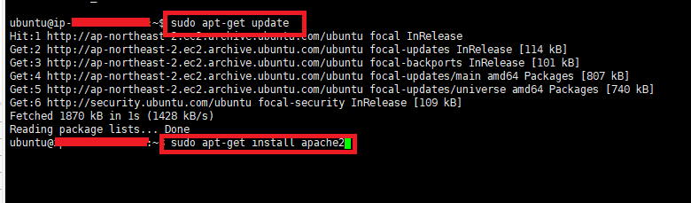 3. 명령어 sudo apt-get install apache2 를 날려 아파치를 설치하자.